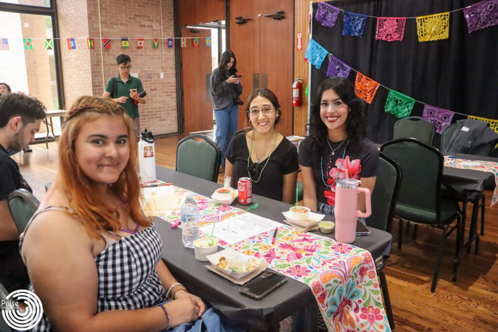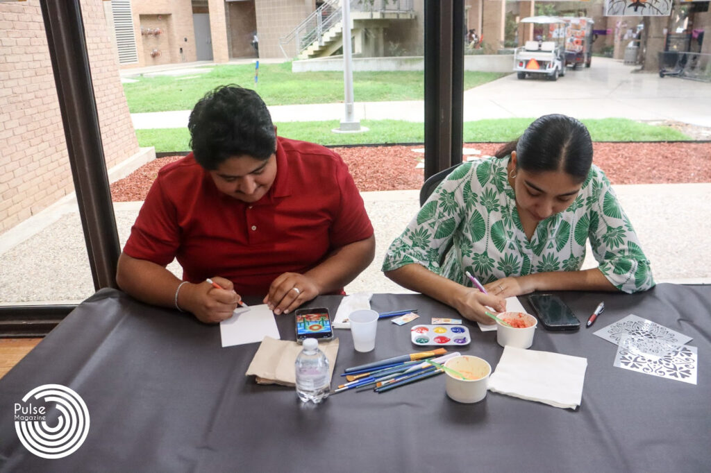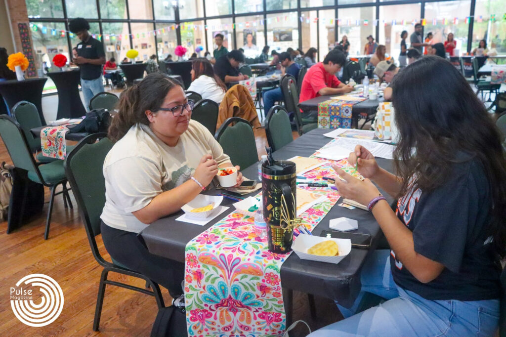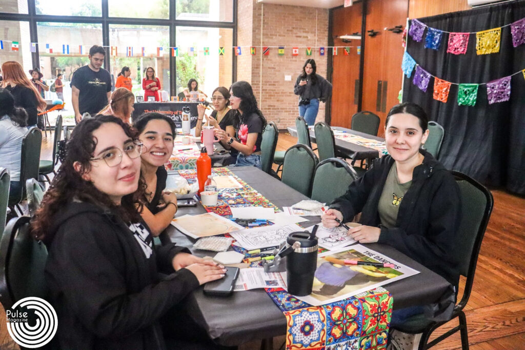 Graduate student Shiara Zarate engages in painting activities Tuesday during Sabor, Cultura y Arte in the University Ballroom on the Edinburg campus. The event hosted by the Center of Student Involvement brought UTRGV students together to honor the diversity and influence of Spanish culture across campus. Logan Huizar/PulseUTRGV theatre freshman Austen Basoria (left), and hospitality and tourism management sophomore Coral Lopez paint Tuesday during Sabor, Cultura y Arte in the University Ballroom on the Edinburg campus. The event featured food, music and hands-on activities that highlighted Hispanic culture. Logan Huizar/PulseUTRGV integrated health science sophomore Marinade Vazquez (left), biology junior Alexia Flores, and psychology junior Alyssa Garcia (right) pose for a picture Tuesday during Sabor, Cultura y Arte in the University Ballroom on the Edinburg campus. The event offered students the opportunity to learn about Hispanic culture. Logan Huizar/PulseUTRGV communication sciences and disorders senior Dina Pizana Rodrigo, communication sciences and disorders senior Joeli Robledo, and communication sciences and disorders senior Keyla Salazar pose for a picture as they participate in painting activities Tuesday during Sabor, Cultura y Arte in the University Ballroom on the Edinburg campus. Logan Huizar/Pulse UTRGV computer science senior Oscar Zuniga, and Spanish sophomore Sara Balderas Rodriguez sketch their paintings Tuesday during Sabor, Cultura y Arte in the University Ballroom on the Edinburg campus. Logan Huizar/Pulse.UTRGV nutritional sciences freshman Sury Carballo (left), and communication and disorders freshman Stefani Coy eats a traditional snack and participates in painting activities Tuesday during Sabor, Cultura y Arte in the University Ballroom on the Edinburg campus. Logan Huizar/Pulse.
