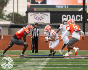 UTRGV Junior Guard Chris Freeman dribbles towards the free-throw circle, while Seattle University Senior Guard Mattia Da Campo tries to...