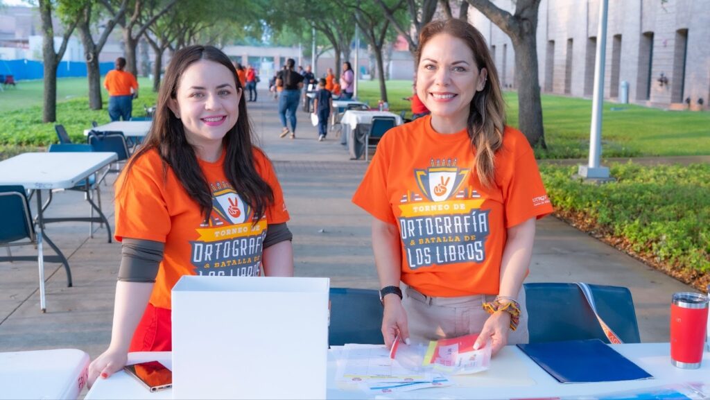 Volunteers assist with registration for the Torneo de Ortografía y Batalla de los Libros at The University of Texas Rio Grande Valley, welcoming participants as they arrive to compete.